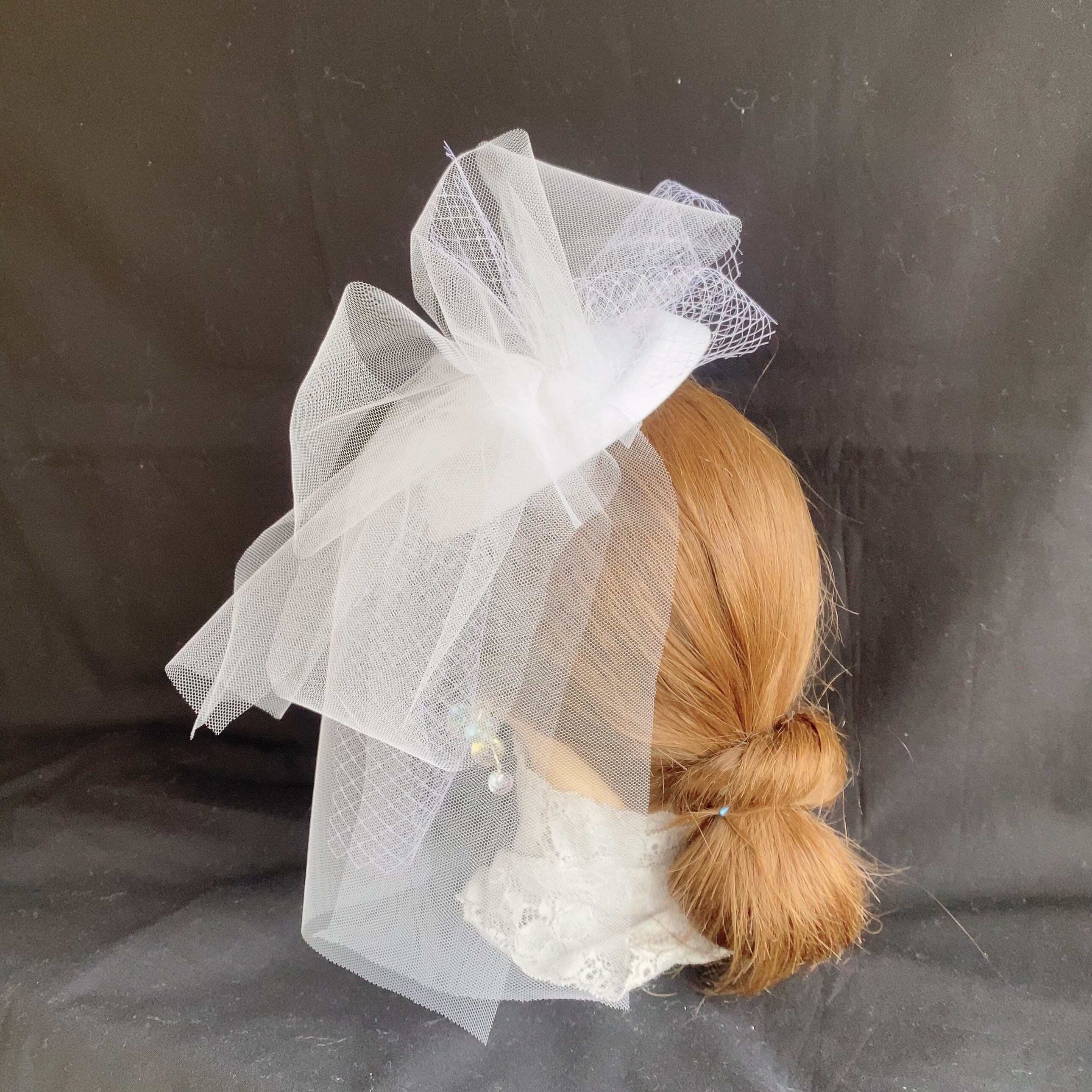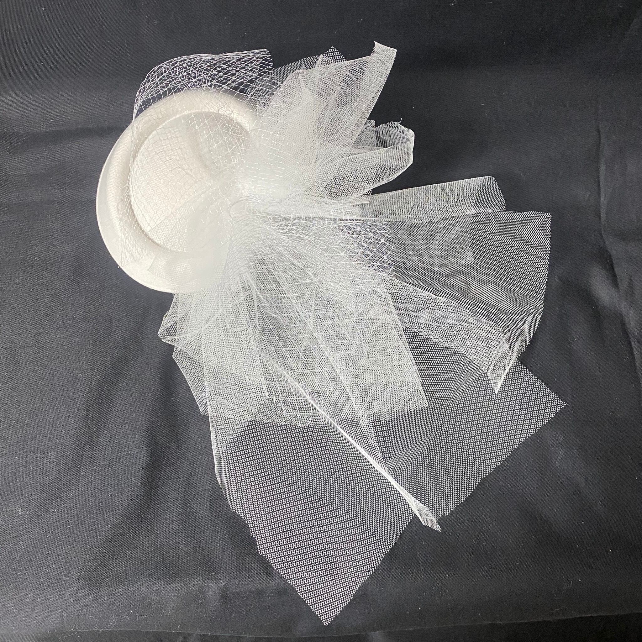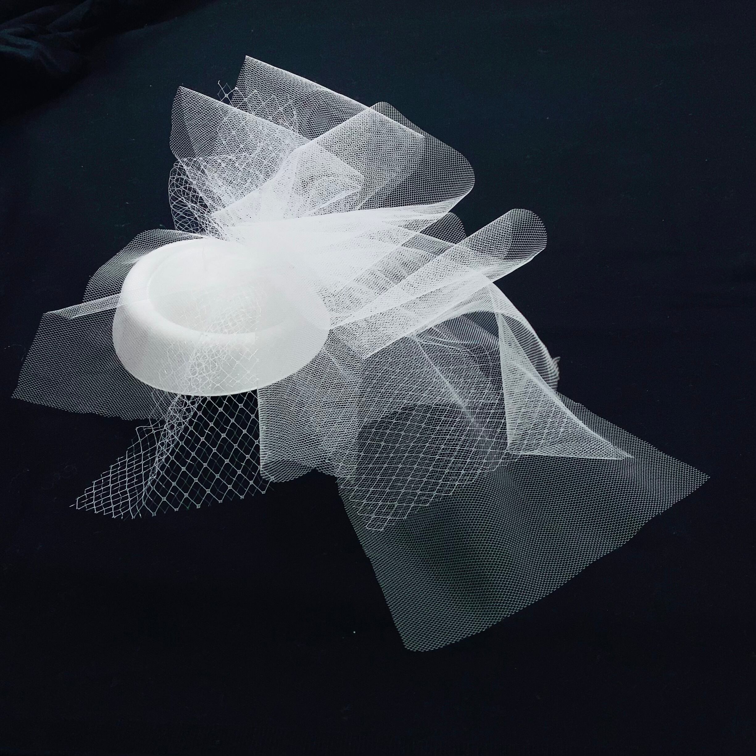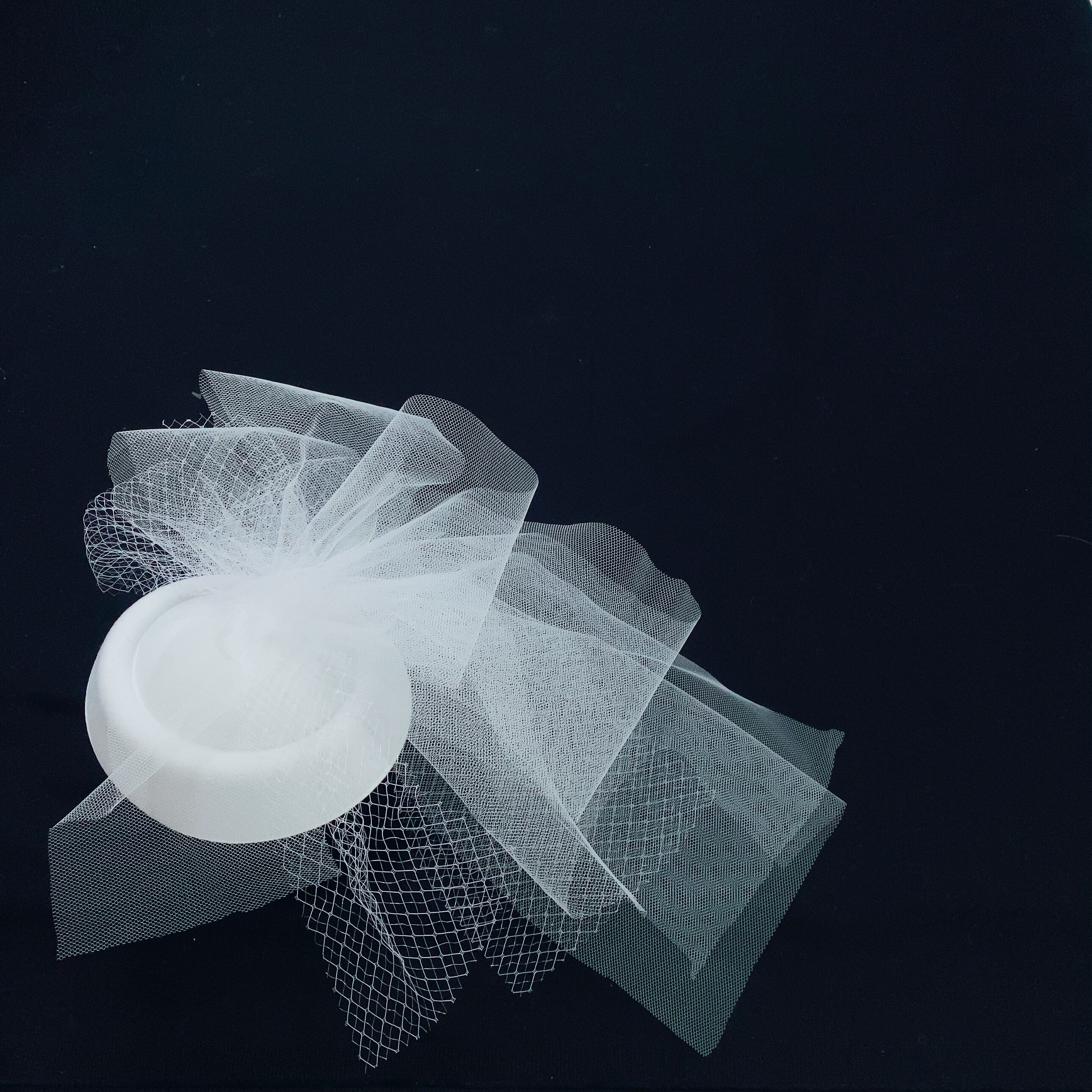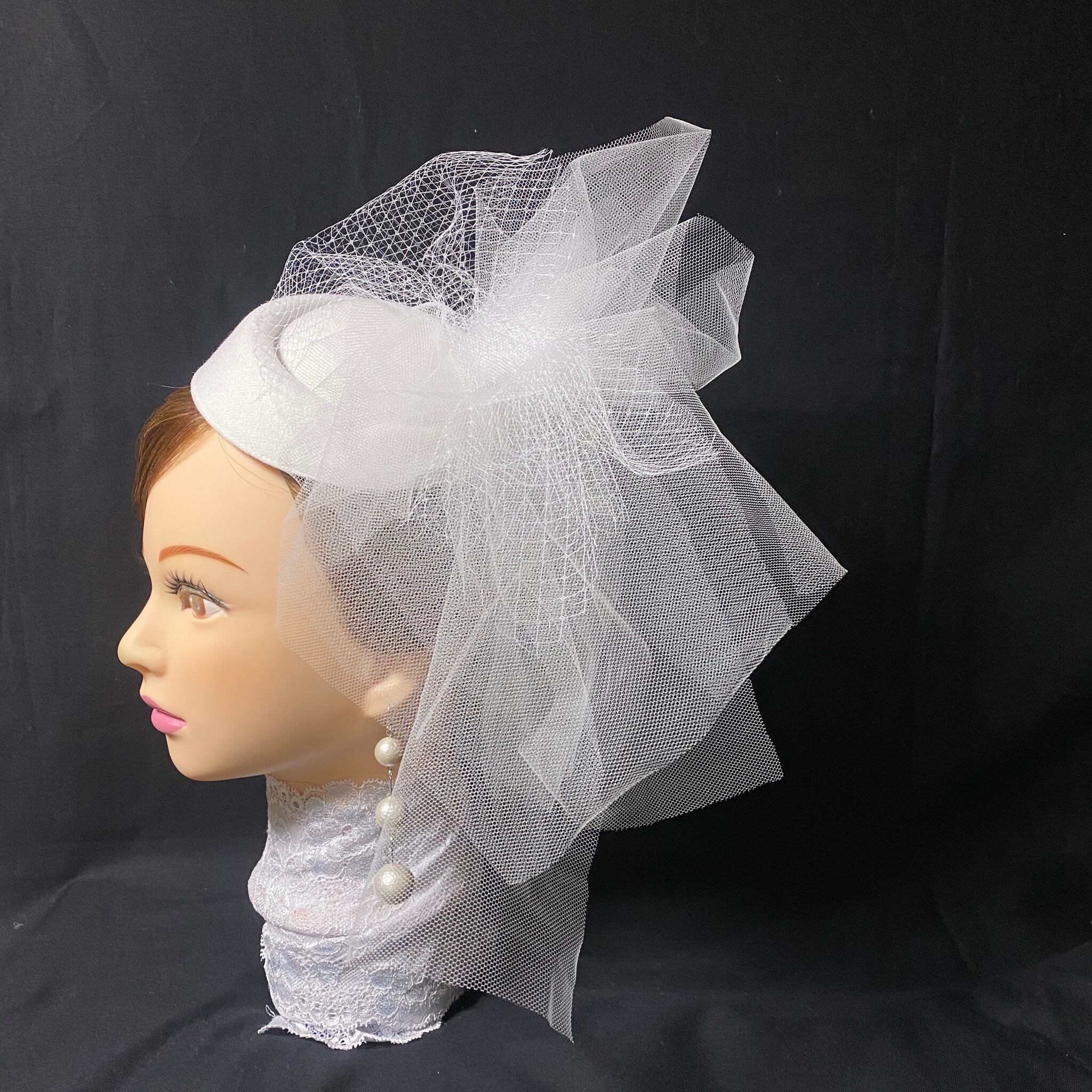 ホワイトのトークハットにホワイトのチュールを2種類使って、立体的にに華やかに作っています。
