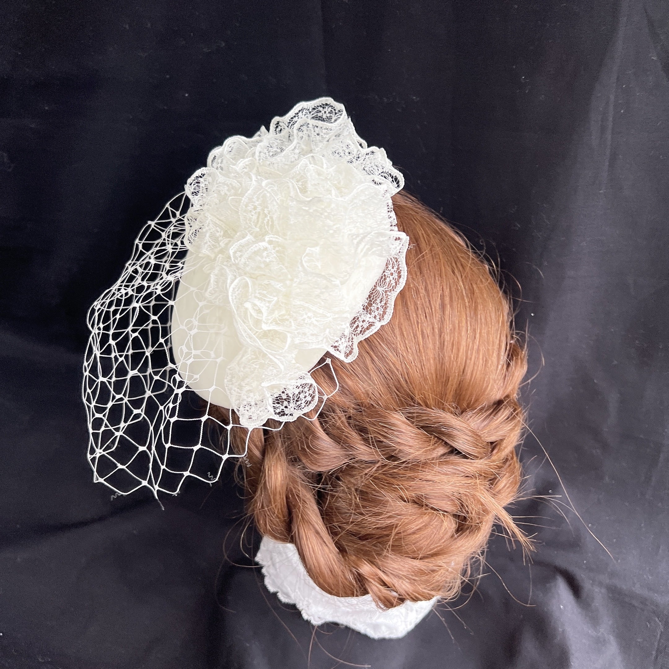 お顔にかかる方には目の粗いチュールを付けて、レトロ大人っぽく。