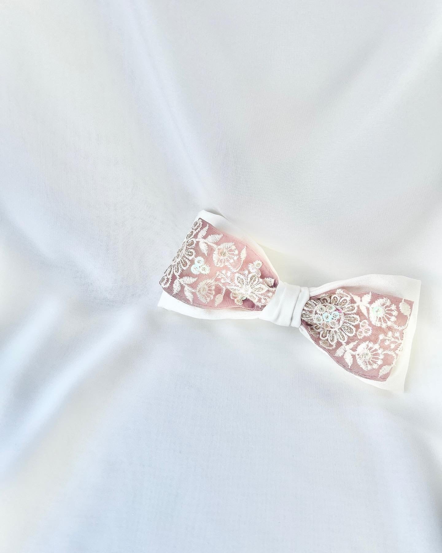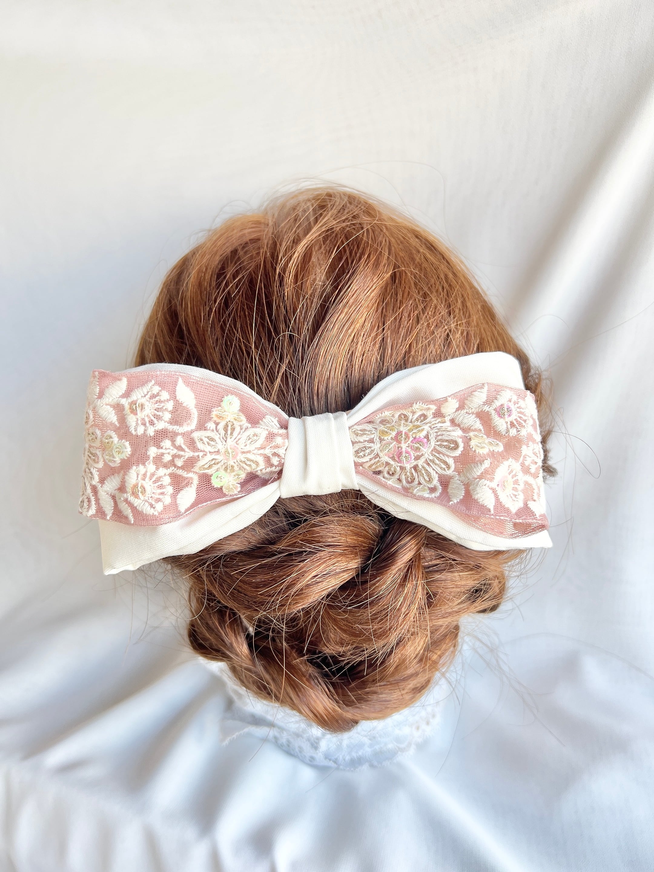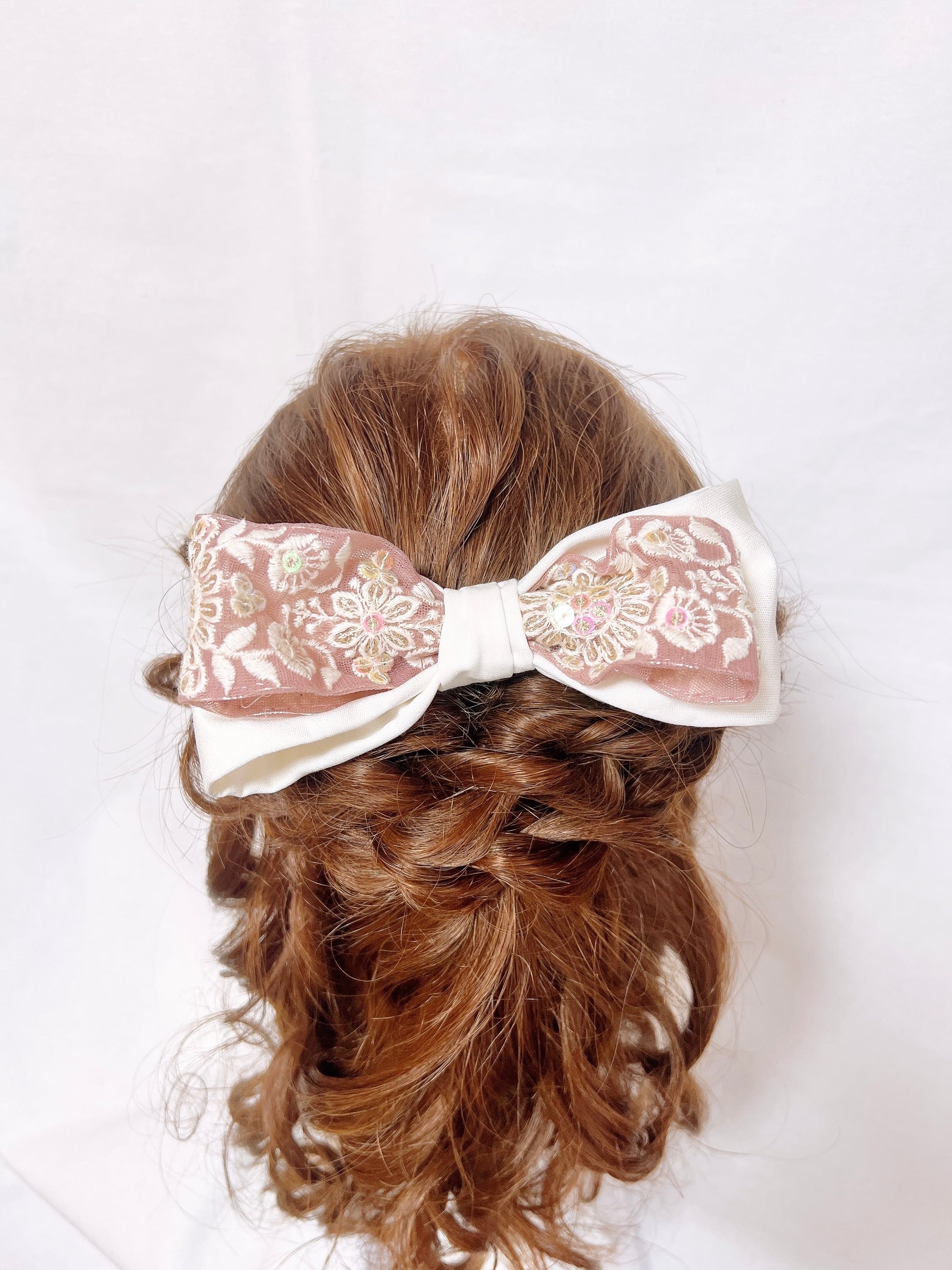 真っ白ではなく、少し黄色よりのオフホワイトの布を、それぞれリボンにしたものを重ねています。